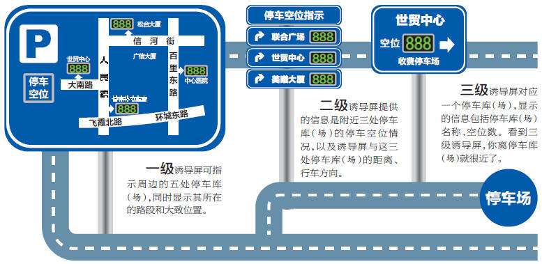 城市停車誘導(dǎo)屏是城市停車誘導(dǎo)系統(tǒng)的重要組成部分,?主要用于實(shí)時顯示停車場的車位信息,?引導(dǎo)駕駛者便捷停車?。? 這類屏幕通常分為一級、?二級和三級誘導(dǎo)屏。?一級誘導(dǎo)屏主要分布在交通主干道上,?顯示附近周邊停車場數(shù)量及初步的停車數(shù)據(jù);?二級誘導(dǎo)屏設(shè)置在次要干道上,?顯示路邊停車位及附近停車場現(xiàn)存的車位數(shù)量;?三級誘導(dǎo)屏則設(shè)置在每個停車場的進(jìn)出口處,?實(shí)時通過閘道口感應(yīng)將收集的數(shù)據(jù)顯現(xiàn)在屏幕上。? 城市停車誘導(dǎo)屏的應(yīng)用有助于調(diào)節(jié)停車需求,?提高停車設(shè)施使用率,?減少因?qū)ふ彝\噲龆a(chǎn)生的道路交通,?提高整個交通系統(tǒng)的效率。