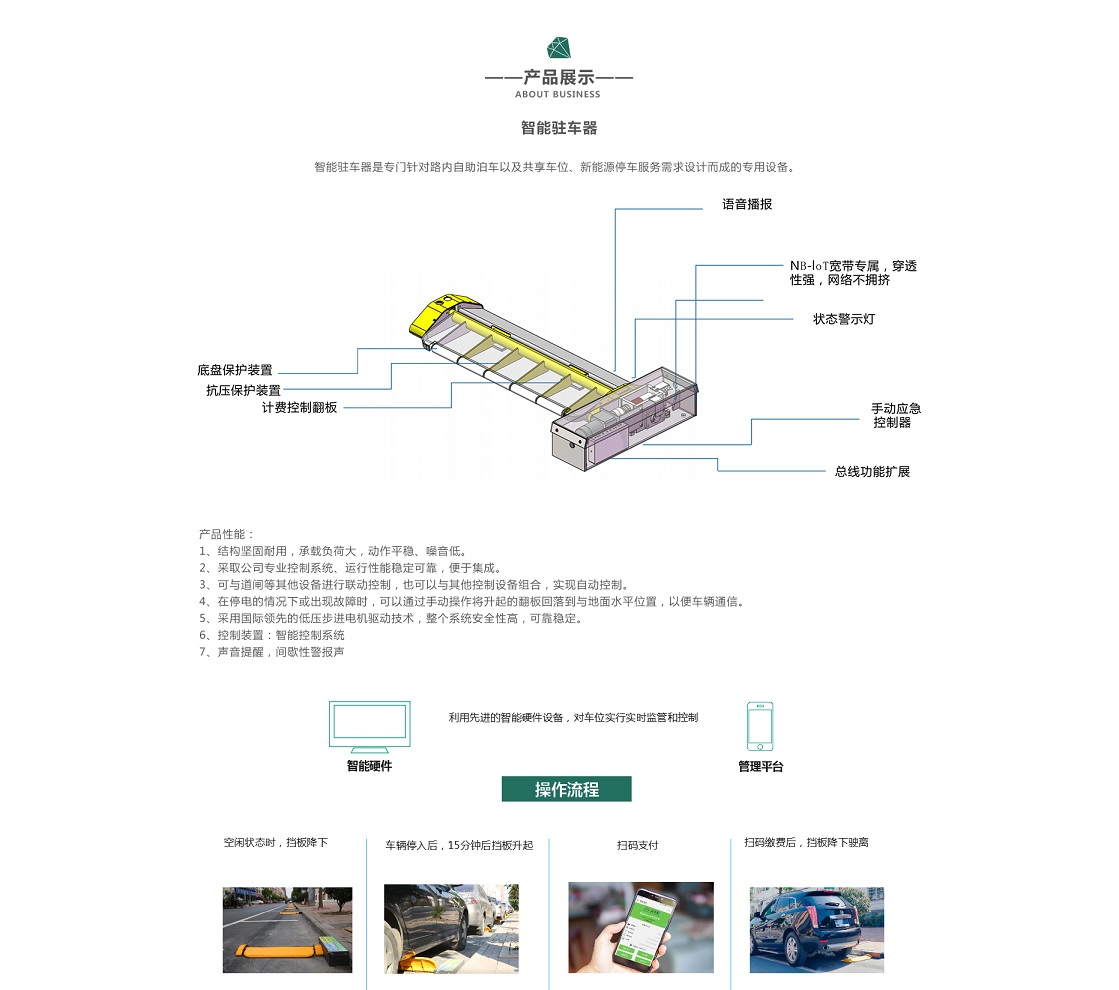 太陽(yáng)能智慧平板車位鎖物聯(lián)網(wǎng)平板車位鎖是一種用于停車固定車輛的設(shè)備,通過(guò)電子控制系統(tǒng)實(shí)現(xiàn)自動(dòng)升降,可用于室內(nèi)或者室外停車場(chǎng)和道路停車。平板車位鎖一般由鎖體、支架、驅(qū)動(dòng)系統(tǒng)、控制系統(tǒng)等部分組成,可以有效地防止非法占位和違規(guī)停車。在使用時(shí),車主可以通過(guò)手機(jī)APP或者遙控器等方式遠(yuǎn)程控制車位鎖的升降,保證車輛的安全和停車的方便。 本系統(tǒng)采用了4G/5G、433/LoRa、藍(lán)牙、AI算法、云計(jì)算、地磁等物聯(lián)網(wǎng)綜合技術(shù),通過(guò)車主手機(jī)掃描物聯(lián)網(wǎng)平板車位鎖身份ID二維碼,依托公共移動(dòng)網(wǎng)絡(luò)完成與管理收費(fèi)系統(tǒng)設(shè)備交互完成繳費(fèi),通過(guò)藍(lán)牙/4G建立與設(shè)備控制之間的通道,完成車輛放行的方法。主要的亮點(diǎn)在于:通過(guò)車主的手機(jī)掃描設(shè)備ID 的二維碼,完成了車主與車位的一一對(duì)應(yīng)。通過(guò)公共網(wǎng)絡(luò)授權(quán)車主利用藍(lán)牙/4G控制物聯(lián)網(wǎng)平板車位鎖擋板升降起落防止逃費(fèi),并達(dá)到讓車主精確到分秒使用車位并通過(guò)第三方支付支付停車費(fèi)用的效果。 物聯(lián)網(wǎng)平板車位鎖在城市路邊停車場(chǎng)的應(yīng)用可以帶來(lái)很多的優(yōu)勢(shì):1.?提高停車場(chǎng)利用率:平板車位鎖可以有效地防止非法占位和違規(guī)停車,保證停車場(chǎng)內(nèi)的車位被合理利用,提高停車場(chǎng)的利用率。 2.?方便停車:司機(jī)可以通過(guò)手機(jī)APP或者遙控器等方式遠(yuǎn)程控制車位鎖的升降,避免了停車時(shí)需要下車手動(dòng)開(kāi)鎖的麻煩,節(jié)省了停車時(shí)間。 3.?提高安全性:平板車位鎖可以有效地防止車輛被盜或者被破壞,保證了車輛的安全性。 4.?實(shí)時(shí)監(jiān)控:物聯(lián)網(wǎng)平板車位鎖可以連接到互聯(lián)網(wǎng),實(shí)現(xiàn)對(duì)車位的實(shí)時(shí)監(jiān)控和管理,車主可以隨時(shí)查詢車位的使用情況,停車場(chǎng)管理人員也可以通過(guò)系統(tǒng)實(shí)時(shí)掌握車位的占用情況,實(shí)現(xiàn)精細(xì)化的管理。 5.?節(jié)省成本:物聯(lián)網(wǎng)平板車位鎖可以實(shí)現(xiàn)自動(dòng)化控制,減少人工管理成本,同時(shí)提高車位的利用率,增加了停車場(chǎng)的收益。